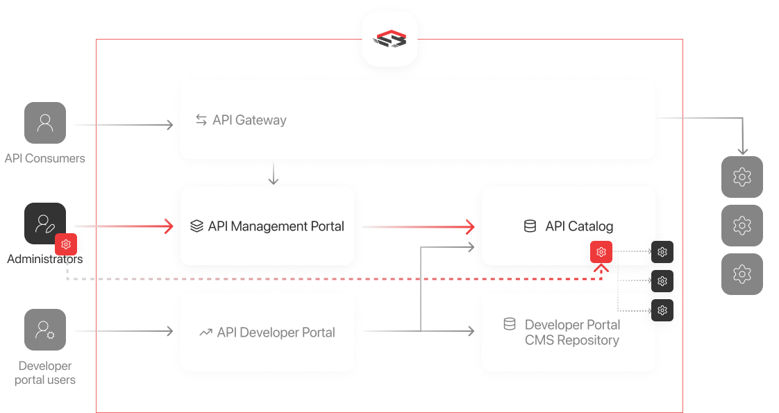 API Gateways dynamically create, update or remove their APIs without Sentinet User’s manual deployments or configuration file uploads. Gateways never directly connect to API Catalog, making it possible to deploy them anywhere in the same or even different networks.